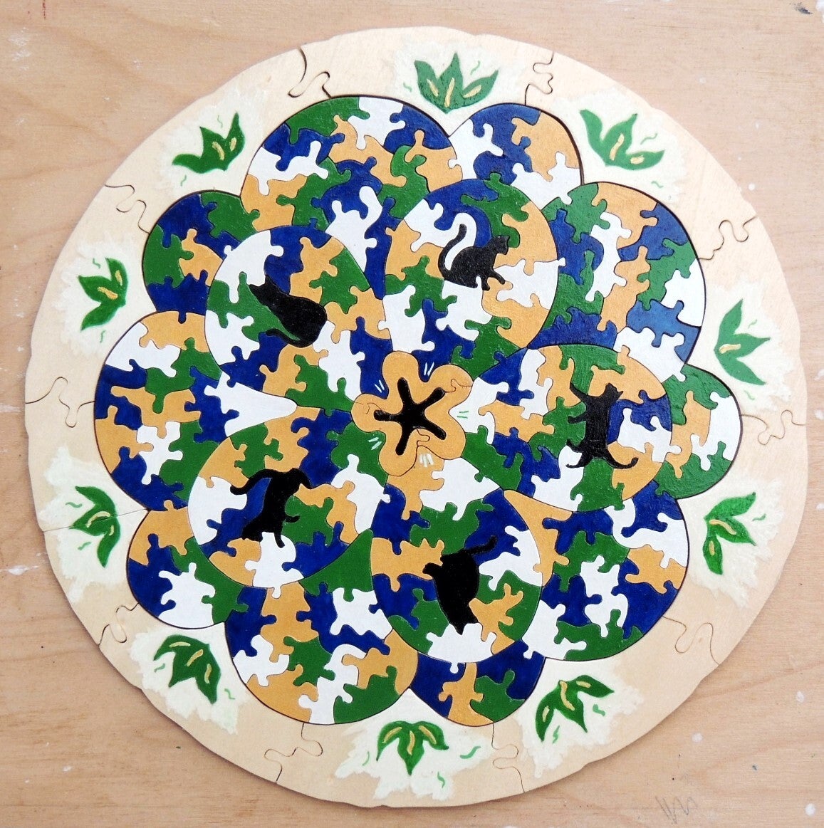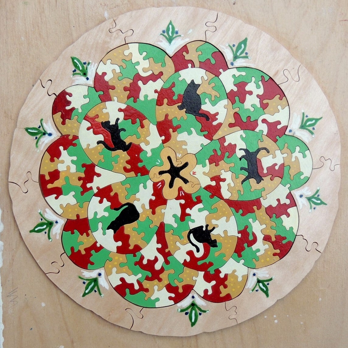Colourful double-sided puzzle featuring little black cats at the centre of each 'petal'. Both sides have each piece individually painted.